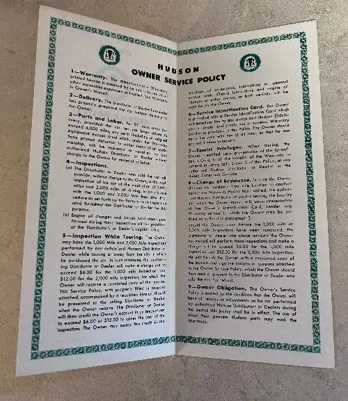 Hudson 1938-1957 New Car Owners Service Policy Vintage New Old Stock Brochure